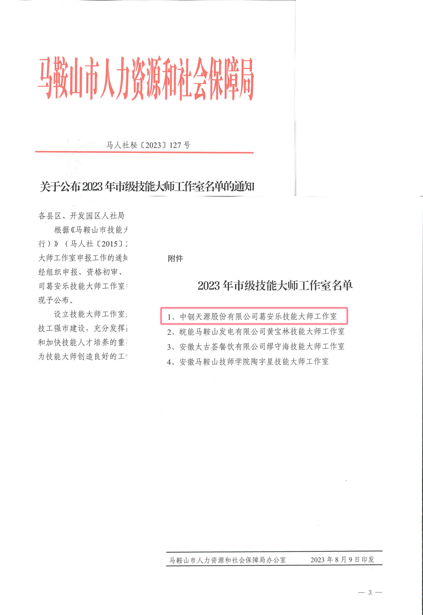 中鋼天源葛安樂技能大師工作室獲評市級技能大師工作室