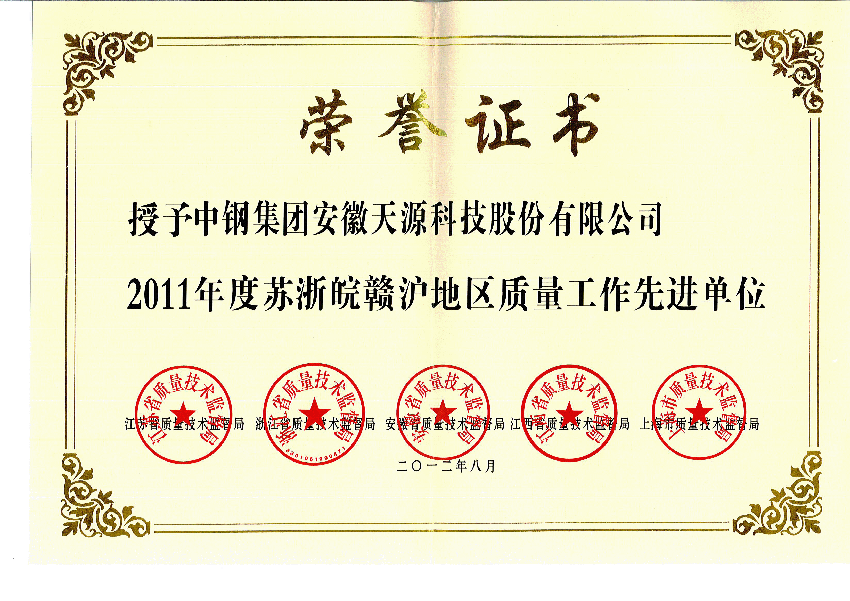 儀式上,對(duì)2011年度蘇浙皖贛滬名牌產(chǎn)品50佳及質(zhì)量工作先進(jìn)單位進(jìn)行了表彰,我公司在眾多參評(píng)企業(yè)中脫穎而出,喜獲“2011年度蘇浙皖贛滬質(zhì)量工作先進(jìn)單位”榮譽(yù)稱號(hào)。中鋼天源公司是唯一獲此殊榮的磁性材料制造企業(yè),這表明了蘇浙皖贛滬地區(qū)政府以及相關(guān)部門對(duì)中鋼天源公司過去一年質(zhì)量工作的認(rèn)可,同時(shí)也是中鋼天源公司堅(jiān)持走質(zhì)量效益型道路的體現(xiàn),這也是我公司在去年榮獲馬鞍市市長(zhǎng)質(zhì)量獎(jiǎng)之后的又一殊榮。