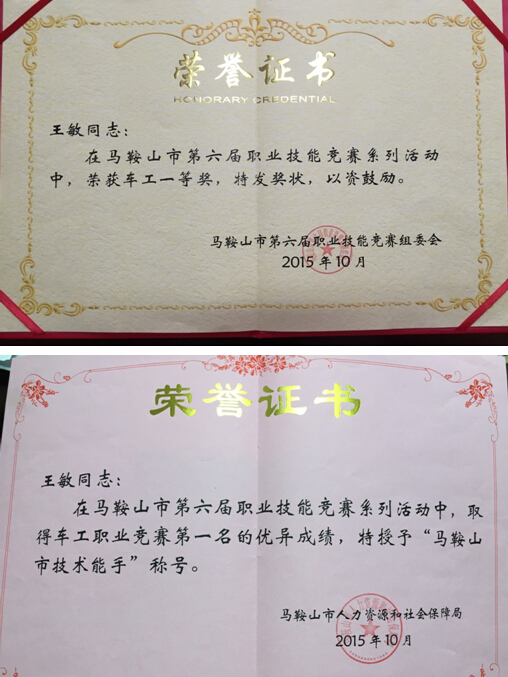 近日,從馬鞍山市人力資源和社會保障局傳來喜訊,中鋼天源機械廠金加工班組王敏同志在市第六屆職業技能競賽系列活動中取得車工職業競賽第一名的優異成績,獲車工一等獎,并被授予“馬鞍山市技術能手”稱號。