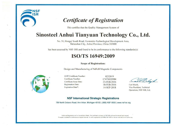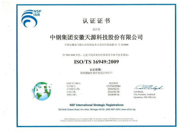 中鋼天源釹鐵硼廠ISO/TS16949:2009質量管理體系認證工作,經過半年多時間的積極準備,順利通過了審核專家組的審核,近日收到了NSF-ISR認證公司頒發的認證證書。