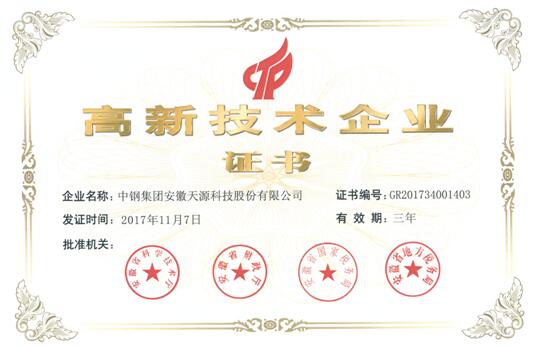 近日,中鋼天源收到安徽省科技廳、安徽省財政廳、安徽省國家稅務局、安徽省地方稅務局聯合頒發的高新技術企業證書,標志著中鋼天源順利通過2017年第二批“高新技術企業”重新認定。這是對公司多年來堅持自主研發、技術創新、堅持走高新技術發展道路的有力肯定。