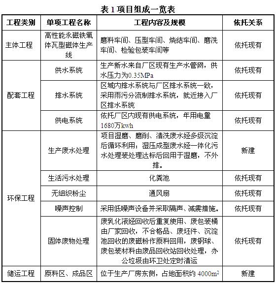 年產6000噸高性能永磁鐵氧體器件項目位于現有二期高性能永磁鐵氧體瓦型磁體生產線內,該項目組成主要包括主體工程、配套工程(供水系統、排水系統、管網、供電)、環保工程等,實際建設工程情況內容見表1。